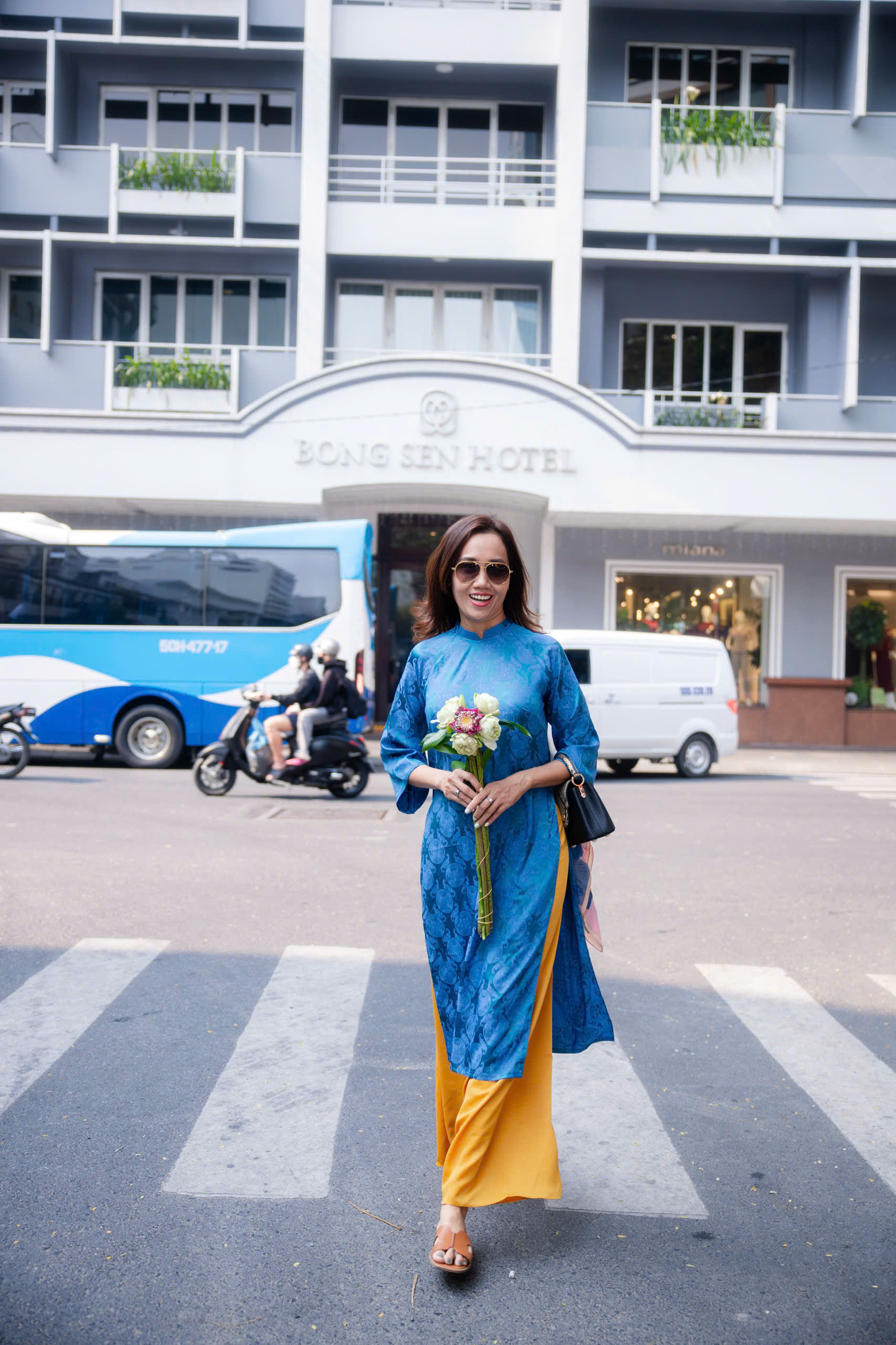 Trong loạt ảnh mới thực hiện giữa trung tâm thành phố, Mỹ Xuân chọn áo dài xanh họa tiết cổ điển phối quần vàng nổi bật. Người đẹp cầm trên tay nhành hoa xuân, nở nụ cười rạng rỡ giữa khung cảnh nhộn nhịp ngày Tết.